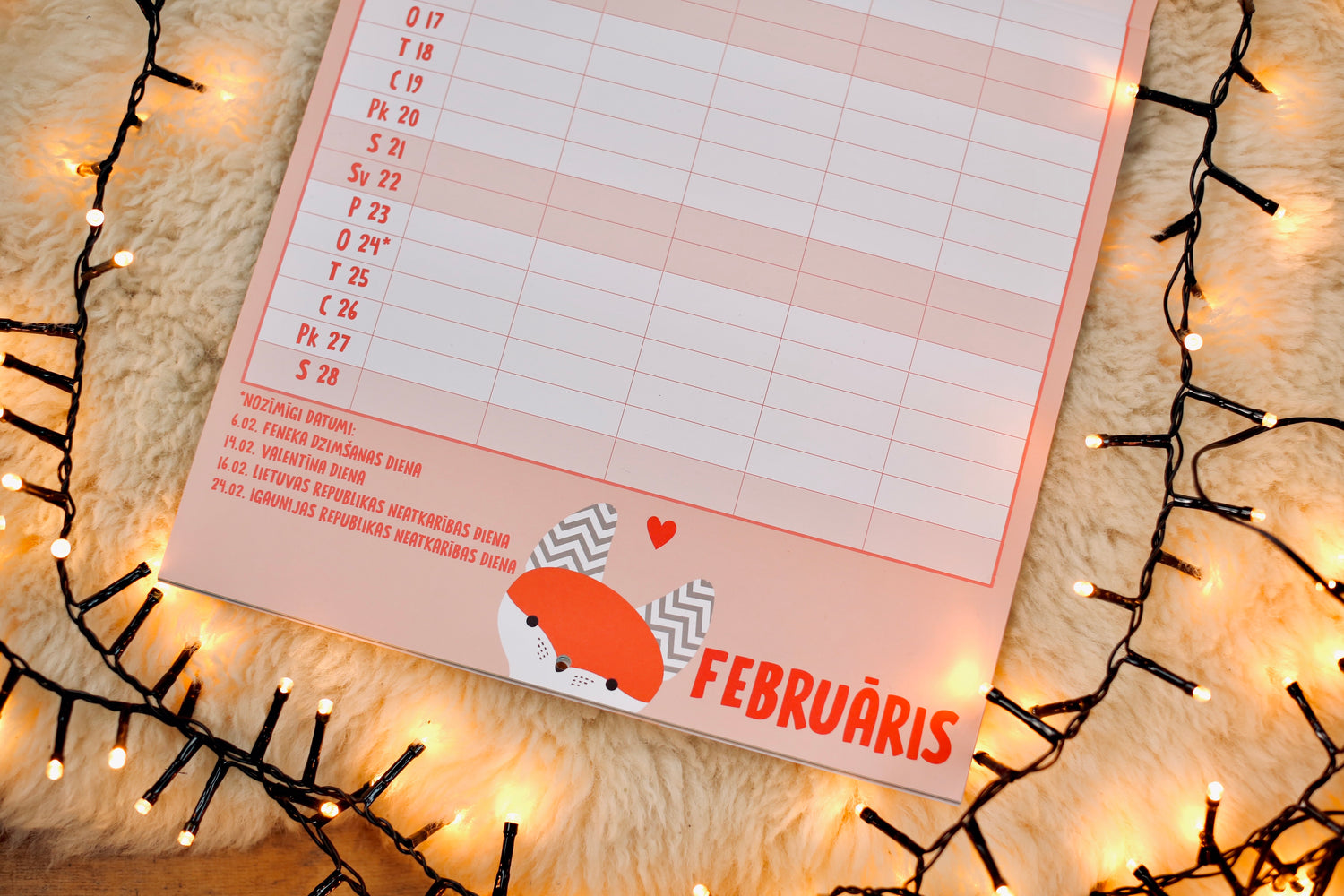 Krāsains sienas kalendārs, kas palīdzēs plānot aktivitātes katram ģimenes loceklim un visai ģimenei kopā. Lapsa kalendārā atzīmējusi svinamos un svarīgos datumus, bet Āpsītis pievienojis skaistas uzlīmes, kas ļaus vienkārši un jautri organizēt mēneša plānus arī pašiem mazākajiem.